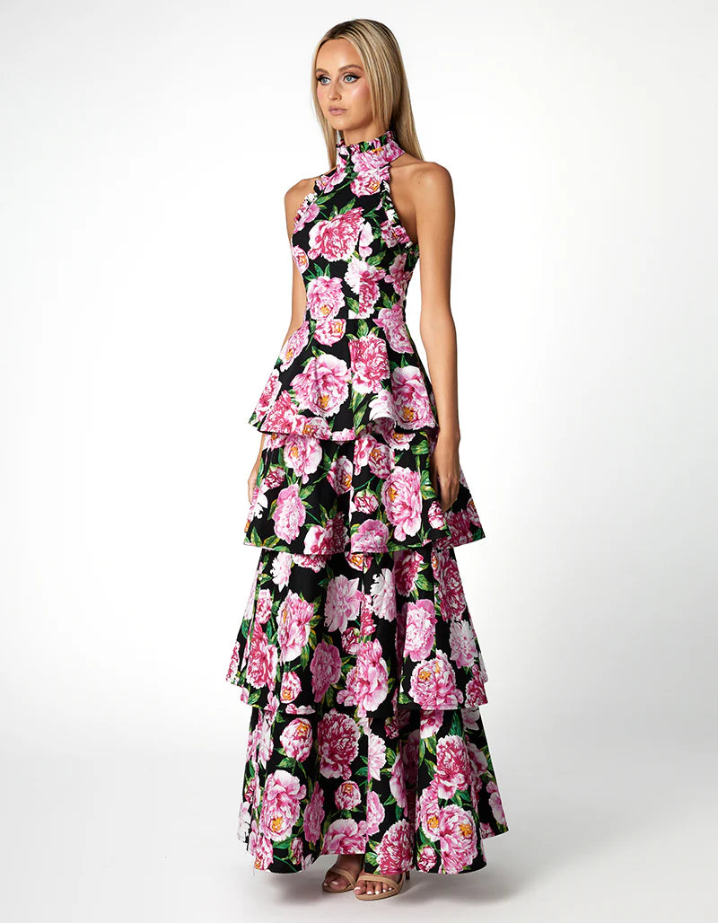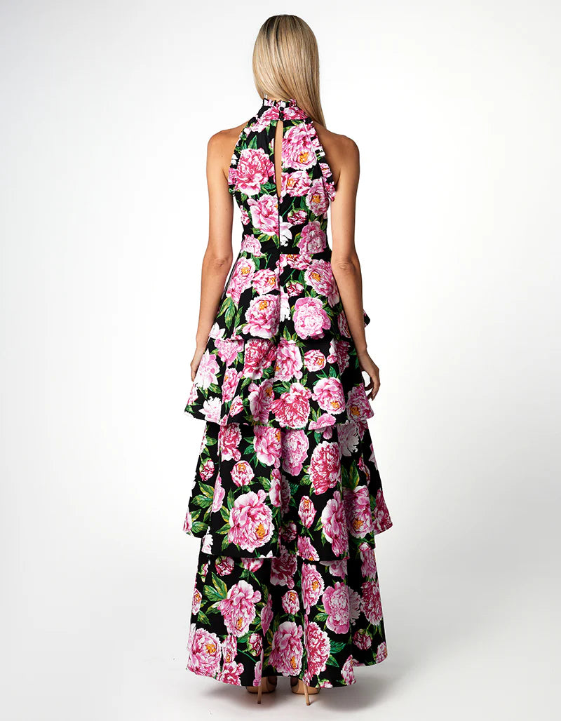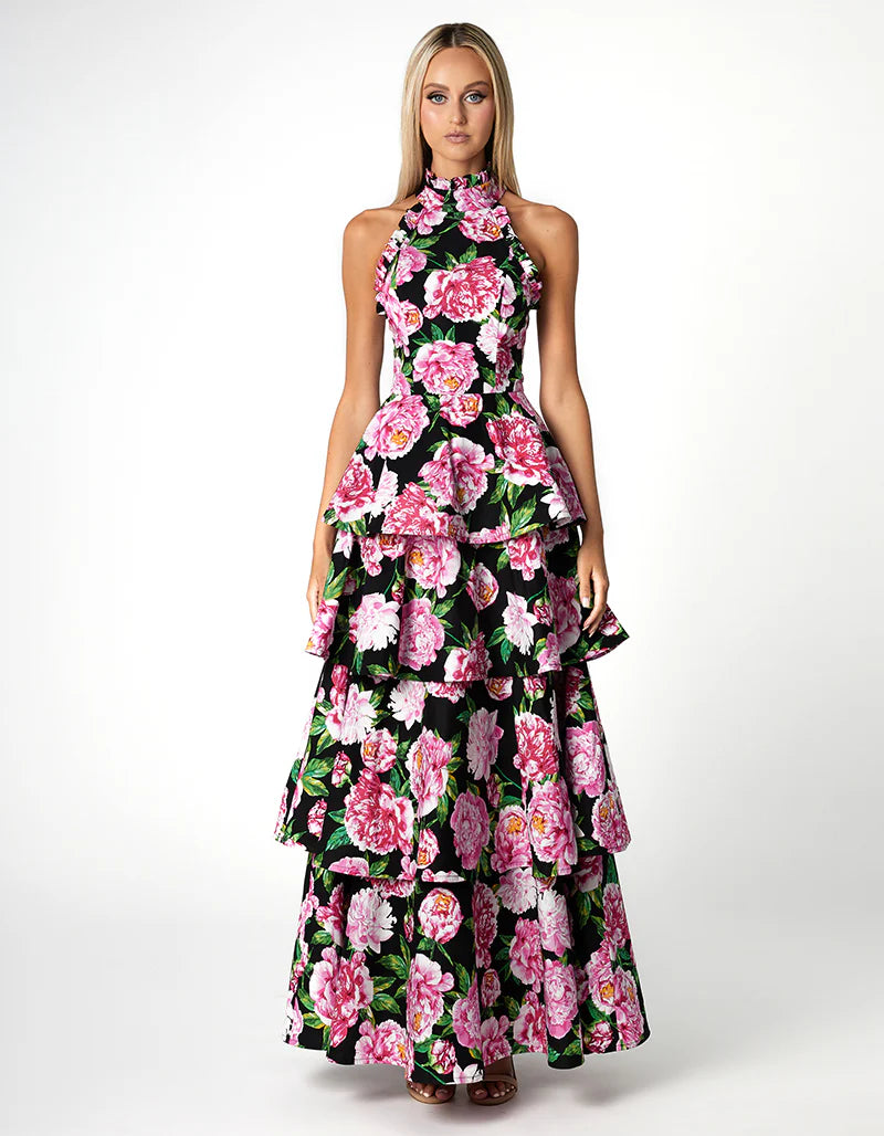Introducing our exquisite ELARA HIGH NECK TIERED MAXI, perfect for summer weddings and garden parties. The high covered neckline features ruffle collar detail for timeless elegance. Embrace the fitted waistline for a flattering silhouette, accentuating your curves with grace. The multi-tiered maxi skirt in an A-line shape flows beautifully, offering movement and charm. Complete with a keyhole opening at the back, this dress is a true statement piece for any outdoor occasion. With its blend of sophistication and flair, it ensures you captivate attention with effortless style and grace. Elevate your summer wardrobe with this versatile ensemble, designed to make every moment memorable.